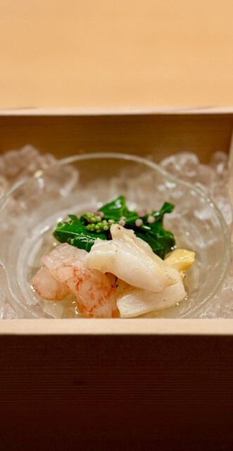 お料理もバラエティに富んでおり、先ずはバイ貝、キジ海老、蔓紫の小鉢だが木箱に入り見せ方も素晴らしい