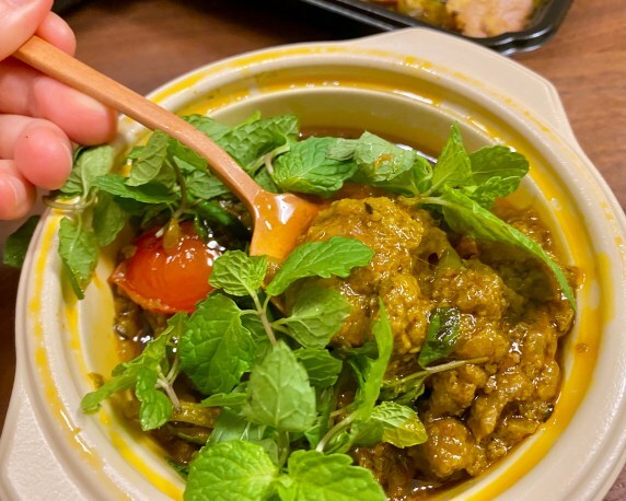 前回テイクアウトした時はミントをカレーに乗せた状態でパックされていたけれど、別添えの方が断然香りが立って美味しさが際立つ。