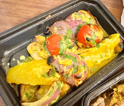 パプリカ、紫玉ねぎ、プチトマト、エリンギ、おくらなどの野菜をスパイスマリネ液に浸してタンドール窯で焼いたシンプルな料理。