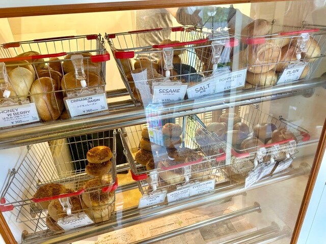 対面式のショーケース内のカゴに並べられたベーグルの数々。