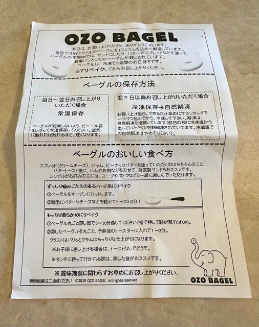 2014年のオープン当初はちょこちょこ通っていた、箱崎町にある人気のベーグル専門店。いつしか人気のあまり営業日も不定期になり、購入はネットで翌月分の通販セットが抽選で当たればというかなり購入難易度高めのお店に。(ちなみに2024年1、2月の通常営業はお休み)「OZOBAGEL(オーゾウベーグル)」本場NYで修行した製法で作られるベーグルは本格的。所用で水天宮近くを訪れた際に、チラッとお店を覗いたら平日の午前中、開店前にも関わらず行列を発見!なかなか営業日に行けるチャンスもないので、せっかくなので行列に並ぶことに。私が並んだ時ですでに前には20人近くの行列、開店しても小さな店内2名までしか入店できないためなかなか列が進まない・・・並び始めて1時間ちょい、寒いし疲れて心折れかけたところでようやく店内へ!対面式のショーケース内のカゴに並べられたベーグルの数々。私が訪れた際は13種類のベーグルが並んでいました。クリームチーズのフィリングやハムやサーモンなどの具材を使ったハーフサンドも販売。お願いすれば、好みのベーグルでサンドしてもらうことも可能みたい。注文を待っている間に、フィリング付きの一切れベーグルを味見させてもらえます。待ち時間が長かった分、この一口が体に染みる〜クリームチーズをベースにしたスプレッドも目が離せない!スイーツ系ばかりでなく、いぶりがっこやスモークサーモンなどもあり。せっかく並んだし冷凍保存もするんだしと自分に言い訳してたっぷり購入!(気付いたら¥5,000以上分も買ってたみたいw)ベーグル各種はもちろん、帰ってすぐ食べるお昼用にとベーグルサンドやスプレッドもゲット!◾️「生ハム&コルニッションピクルスいぶりがっこクリームチーズのハーフサンド @550(税込)」半分にカットした全粒粉ベーグルの間には具材がぎっしり!むにゅっと力強いベーグル生地に、生ハムの塩気にピクルスの酸味、いぶりがっこのスモーキーな風味と食感がクリームチーズでうまいことまとめられていて食べ応えも十分。しょっぱいのを食べたら甘いのもということで。◾️「シナモンアップルクリームチーズのハーフサンド @500(税込)」試食させてもらって美味しかったシナモンアップを再び。ベーグルはココナッツで。シャクシャクとしたローストココナッツの風味が良い生地に、優しく香るシナモンとりんご煮の組み合わせ。さすがにどっしり生地のベーグルサンド丸々1個分はお腹に溜まるw丁寧に記載された美味しく食べるためのリーフレット。蒸してからトーストするリベイク法、試したことなかった!国産小麦、天然酵母を使ったこだわりのベーグル達。◾️「プレーン @300(税込)」生地のおいしさをシンプルに楽しむならベーシックなこちら。女性の手のひらを覆い尽くすほどの大きくどっしりなベーグル。(カット断面)買った当日はリベイクせずそのままでぱくり。パンっと張った表面に対し、中はムギュッとしつつも意外とソフト食感。もちもちっとしているのに口溶けは良く、噛むごとに生地のほのかな甘みや小麦の風味も感じられて後を引く。◾️「ソルト @330(税込)」岩塩が味と食感にアクセントをプラス。(カット断面)ガリっとした岩塩が生地の美味しさをより引き立てていて、食事系にもデザート系にも使えて便利!◾️「シナモンレーズン @360(税込)」レーズン好きとしては外せない!(カット断面)ほんのり香るシナモン生地に、時折覗くレーズンがやっぱりよく合う!欲を言えば、もうちょっとレーズン増し増しだと嬉しいな。◾️「オニオン @330(税込)」表面にたっぷりのローストオニオンがかかってます。(カット断面)口に入れる前から漂う、香ばしいローストオニオンの香り。カリカリっとほろ苦いくらいにローストされているオニオンがとっても特徴的!◾️「はちみつWクランベリー @360(税込)」はちみつ入りの生地にクランベリーとブルーベリーが練り込まれたタイプ。(カット断面)こちらもベリーの量は決して多くはないかな。単体でももちろん美味しいけれど、ベリー入りのスプレッドをつけてよりベリー感をアップして食べるのがおすすめ!◾️「全粒粉エヴリシング @350(税込)」全粒粉入りの生地に白ごま、ケシの実、岩塩、玉ねぎ、ガーリックがトッピング。(カット断面)ガーリックの香りが食欲をそそり、これは甘めのスプレッドより食事系としてサーモンやハムとクリームチーズなどとの組み合わせが合うタイプ。◾️「いぶりがっこ(90g) @500(税込)」普段自宅でもいぶりがっこにクリームチーズをサンドして食べたりしているので、馴染みもあり間違いないペア。他の甘いスプレッド類よりも、娘はこれが一番好きなようですw◾️「ベリーベリー(90g) @500(税込)」クリームチーズにクランベリーやブルーベリーが入ったタイプで、甘さは控えめ。◾️「ピスタチオ @600(税込)」限定品の文字に惹かれてつい購入。ピスタチオペーストが練り込まれたクリームチーズにカシューナッツが入っています。◾️「メ