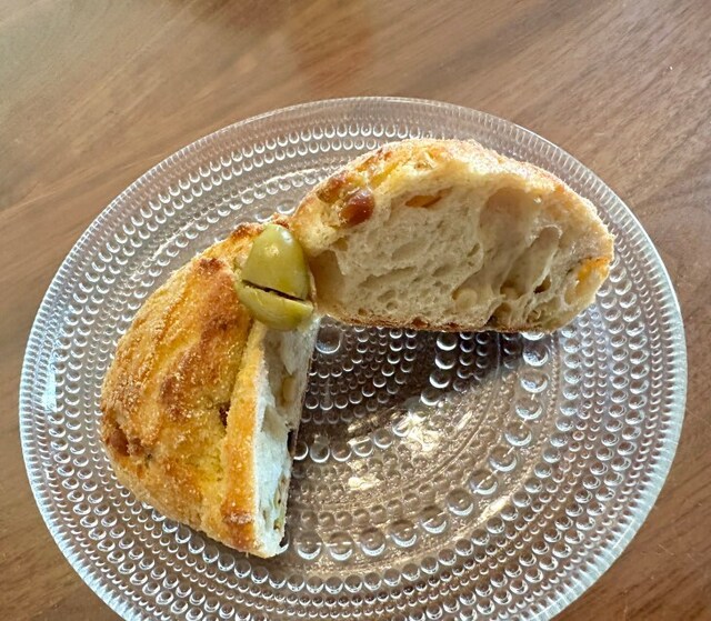 グリーンオリーブだけでなく、松の実が入り表面にコーンミールをまぶしてあるのがポイント高い。