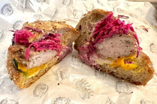 雑穀パンの間には紫キャベツのマリネや自家製サルシッチャ、かぼちゃをサンド。