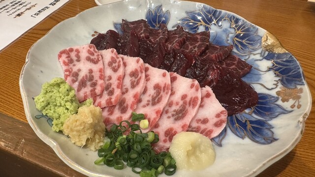 この日は鯨づくしのフルコース(自称)を堪能。まずは「刺身盛り合わせ」。上赤身、鹿の子と尾の身が美しく盛られ、それぞれの部位ごとの風味と食感の違いが楽しめます。とりわけ尾の身は、40年前の記憶が一気によみがえるようなとろける旨味。脂の甘さと赤身のコクが口の中で溶け合い、思わず言葉を失うほどでした。