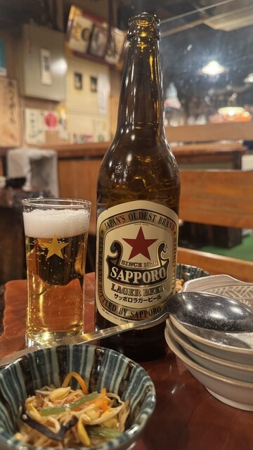 そして、最初に運ばれてくる小鉢の惣菜も地味ながら嬉しい心遣い。サッポロラガービールの瓶とともに、昔ながらの居酒屋らしい空気感が店内に広がっており、どこか懐かしくも温かい気持ちにさせてくれます。