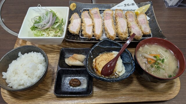 ブランド豚の割にそんなに高くないなと思います。ご飯にサラダ、豚汁、漬物、そしてトンカツの定食でまずはお汁からと一口飲むと、あ、コレ当たり確定。豚汁からめちゃくちゃ美味いです。こちらも黒豚の豚汁?お汁の甘さから違い、旨み成分が今まで食べてきた豚汁とは別次元。