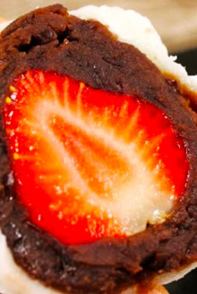 いちご大福を割ってみると、みずみずしくて大きいいちごが丸々!アンコも甘すぎなくて、バランス最高です。