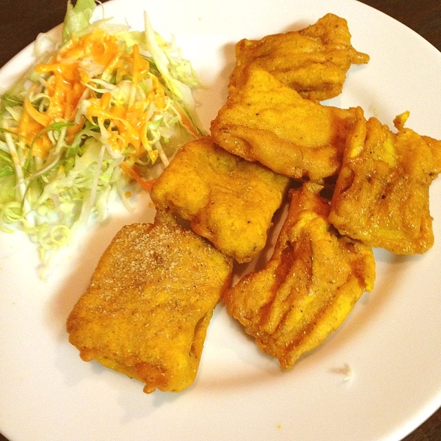 今回は、サラダのサモサチャートに始まり、つまみに魚天ぷらのフィッシュパコラ、メインは嫁がカボチャとチキンのカレー、私が砂肝のカレーです。カレーにはナンかサフランライスが付くので、それぞれ取ってシェアします。