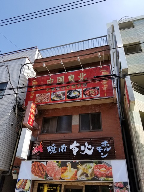 看板には大きく「中国東北本場延辺家庭料理」と記されている。