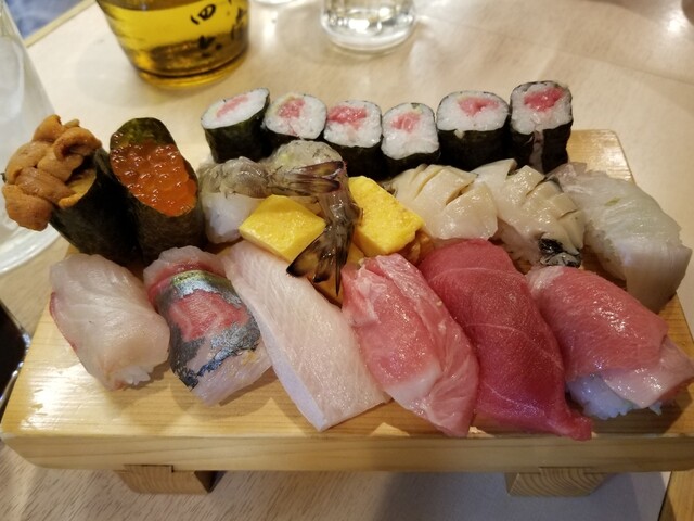 「生本マグロ赤身」「生本マグロ中トロ」「生本マグロ大トロと中トロの重ねにぎり」「ブリ腹身」「シマアジ」「マダイ」「エンガワ」「アワビ」「活車エビ」「イクラ」「ウニ」「生本マグロ鉄火巻」に「玉子」という感じだった。