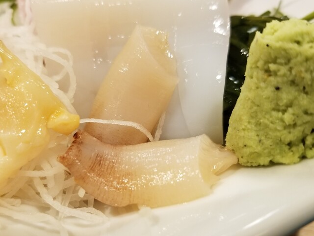 ツブ貝・平貝の貝の刺盛りを食べていたら、その器に、どんどん盛られる。