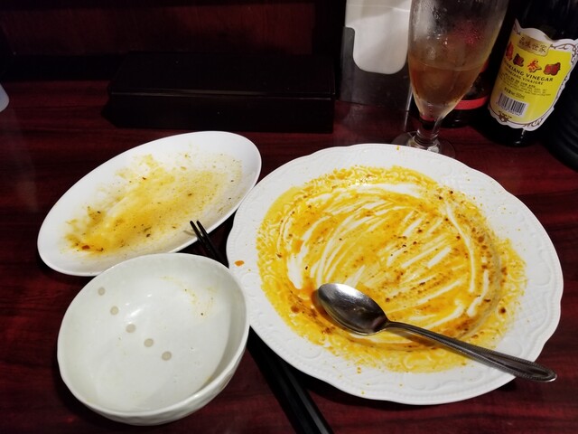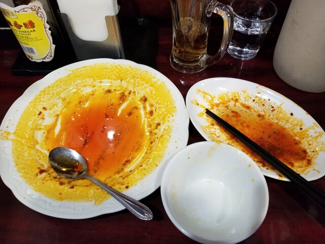 唐辛子は残すが、楊のラー油は美味しいので、スプーンで拾って、メシと一緒に口の中へ。