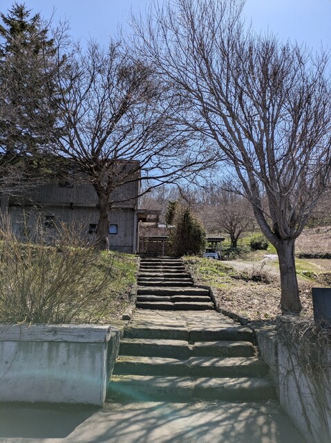 道路沿いに4~5台車が停められますが、そこから階段を上ってお店です。