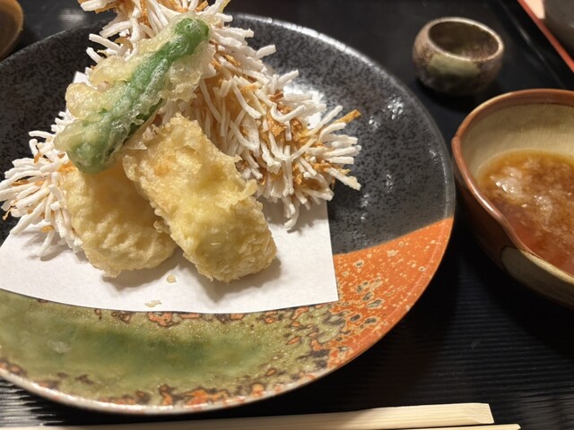 前菜、お造り、焼魚、麩田楽、湯葉しんじょう、湯豆腐、天ぷら、ちりめん山椒ご飯と赤出し、水菓子のコース。