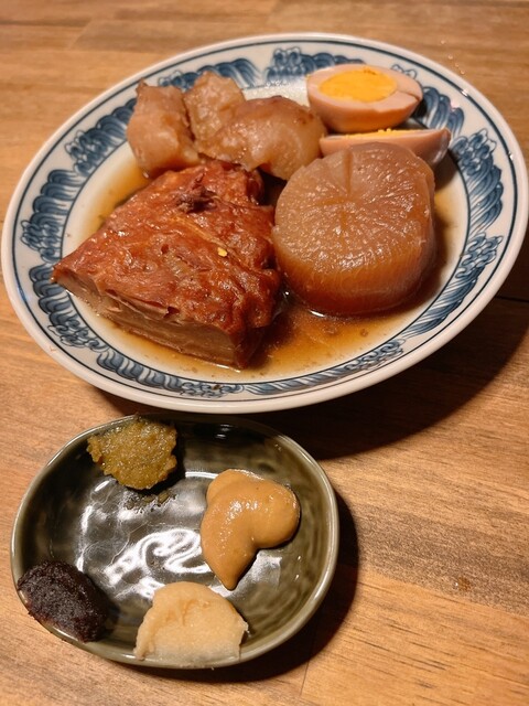 さらにおでん・玉子と和牛すじの提供も早くて、こちらはカラシ、柚子胡椒、白味噌、赤味噌が添えてありました。