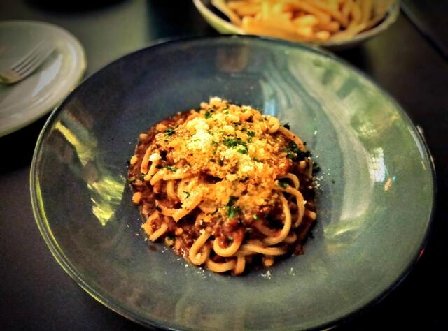 以前食べたときに美味しかった、生パスタを使用したボロネーゼとフライドチキンをオーダーしました。この他に、800°DEGREESでビールに合う肉系とフライ系のおつまみもオーダー。