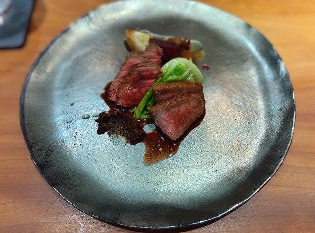 仙台牛のには先ほど出していただいた赤ワインを合わせます。旨味を感じる濃厚な脂を纏ったお肉にピッタリです。やっぱりお肉に赤ワインは合いますね。