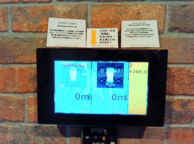 店内はまだ新しくて、オシャレできれい。中央部にはカウンター席があり、こぎん刺しを模したデザインの店名のネームプレートが配され、奥の方にブリュワリーの醸造タンクがあります。出迎えてくださったスタッフさんは可愛くてとてもフレンドリー。丁寧にこちらのお店のシステムを教えてくださいました。