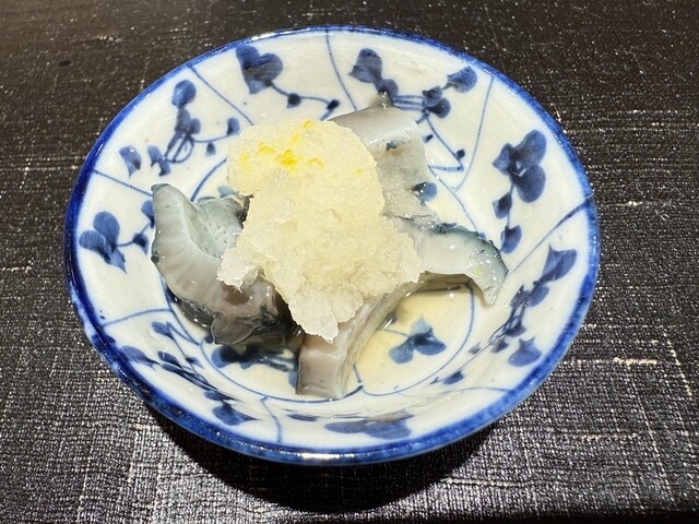 河豚の皮と身と白子と独活と芹 牛蒡のたたき