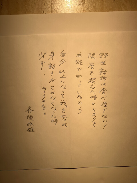 斉須シェフの事を記載した書物を読んだ事がある。シェフ曰く、ランブロワジーでベルナールパコー氏から学んだ事を今でも実践している。そのため、下ごしらえに時間をかけ、しっかりと五感を働かせて調理している。何十年も同じ事の繰り返しで身体に染み付いているのだろう。