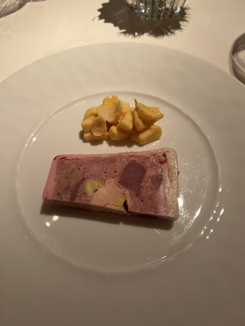 この時期に出てく白ワインムース。白ワインの香りと酸味がムースに溶け込んでいる。上の白ワインジュレもさっぱりとして美味しい。