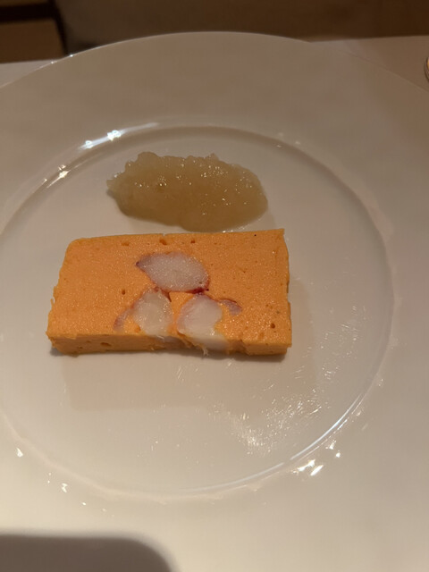 実はこの日、久しぶりに王道メニューのオマールのテリーヌ ダニエル風がメニューに載っていた。とても迷ったのだが、、、。最もメニューを迷うのも楽しみの一つかもしれない。ムニュデギュスタシオンのみのレストランが増えるなかで、アラカルトを楽しむ、というレストランがもう少し増えてほしいものだ。斉須シェフも70代半ば。とはいえ、以前に厨房を拝見させて頂いた時、シェフに"すきやばし次郎の小野二郎さんは90過ぎてもつけ場に立って握ってるのだから、またまだですよ引退は"と話をした。帰り間際、斉須シェフには頑張ってほしいなー、と松下さんには伝えておいた、、笑