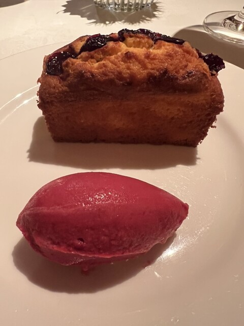 甘酸っぱく、香りが素晴らしい。焼きたての熱々も美味しさのうち。パウンドケーキの間に入っているジャムもいいアクセント。また、添えてある酸果桜桃のソルベも酸味がきいて美味しい。むしろこの時期のデザートとしてもいいかも。