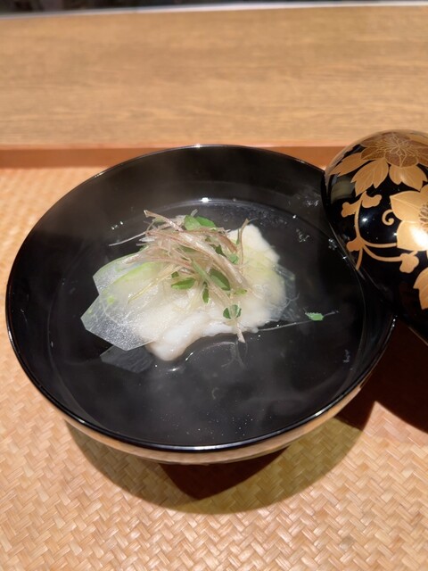 出汁がさっぱりしており、淡白なスズキに茗荷や木の芽の香りが良く合う。出汁を吸った冬瓜も美味しい。