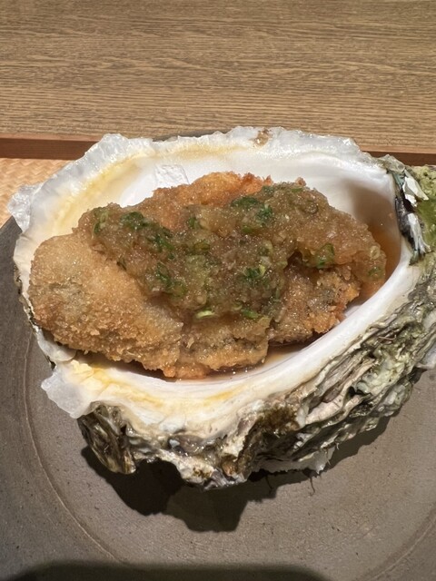 岩ガキのフライは中はレア。これをちり酢(ポン酢)と大根おろしでさっぱりと頂く。私はカキはフライが一番美味しい食べ方と思っている。このちり酢で頂くのはなかなかいい。カキの甘さを引き立てる。