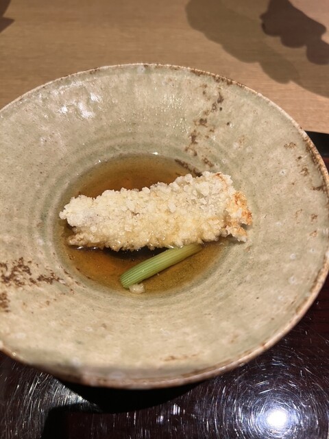 きすにおかきを細かくしたものを衣にして揚げたもの。焼いた野蒜を添えてある。それに出汁をはったもの。おかきが衣だと歯ごたえがいい。きすのさっぱりとした味に野生味のある野蒜。出汁も少し甘めで私好み。