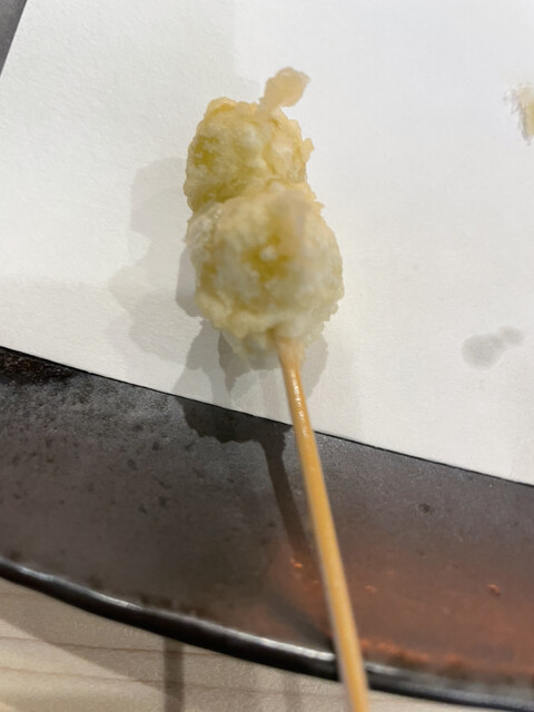 海老・銀杏・石垣鯛・舞茸・ズッキーニ・イカ・タマネギ・穴子の順に提供して頂きました。