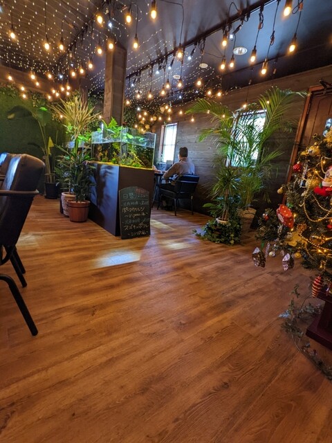 お昼を過ぎて先客は3組、少し薄暗いけど天井からのイルミネーションが12月らしく良い感じです。壁が緑の人工芝だったり、大きな水槽があったり、そしてテ−ブルも椅子もゆったり、