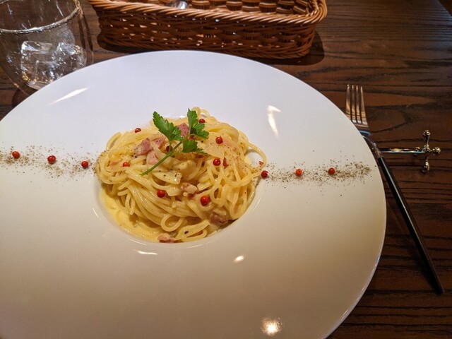 さて待つこと暫し、カルボナーラはおしゃれな皿で登場、カルボナーラってアツアツご飯に生タマゴとは違って卵が固まらないようにアツアツではないのは致し方無いけど美味しくいただきました。
