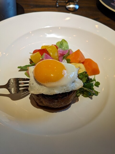 待つことしばし、ハンバーグは予想よりもボリュームというか嵩が有り、その周りにカラフルな鮮度の良い野菜。見た目も麗しい。ちょっと味見したらうまい! そう言えば厨房からハンバーグを手でエア抜きする音が良く響いてました。外見がちょっと炭火焼きパリッでこれがこの値段とは!!
