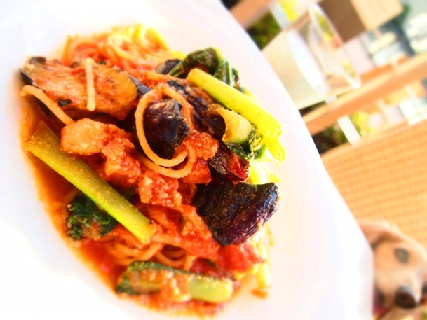 それにサラダと茄子のトマトパスタを単品でオーダー。各¥1300