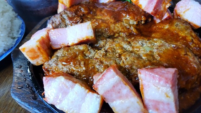 切ったベーコンを横に移動してハンバーグの全貌をチェック