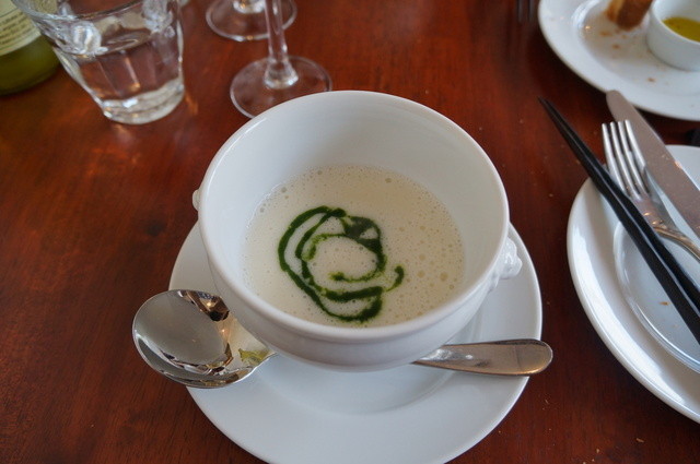 前菜、スープ、おさかなのメイン、見た目も素晴らしく、シェフが料理の内容を説明してくれる