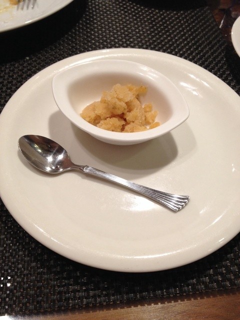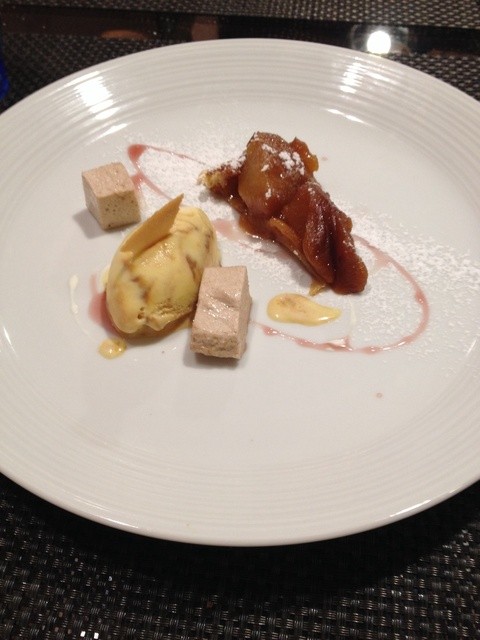 デザートはタルトタタンとアイスクリームの組み合わせで、双方ともに非常に甘さ強めなのが少々気になりました。最後にリンゴのシャーベットが提供されたのはそのためでしょうか。