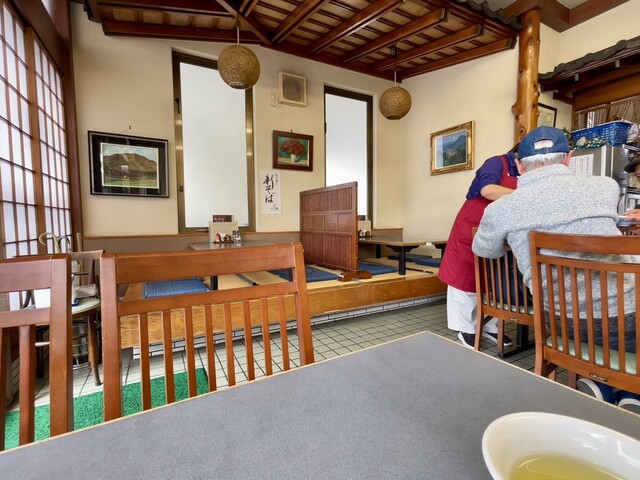 平日13時過ぎの訪問。入口で声をかけ店内を見渡し、適当であろう出入口付近の4人掛けテーブル席に着き、店頭で見かけた今週のおすすめメニュー きのこ天丼と新そばのせいろそば900円に決め、溢れんばかりの満面の笑みが可愛らしい、若女将であろう姉さんへオーダー。