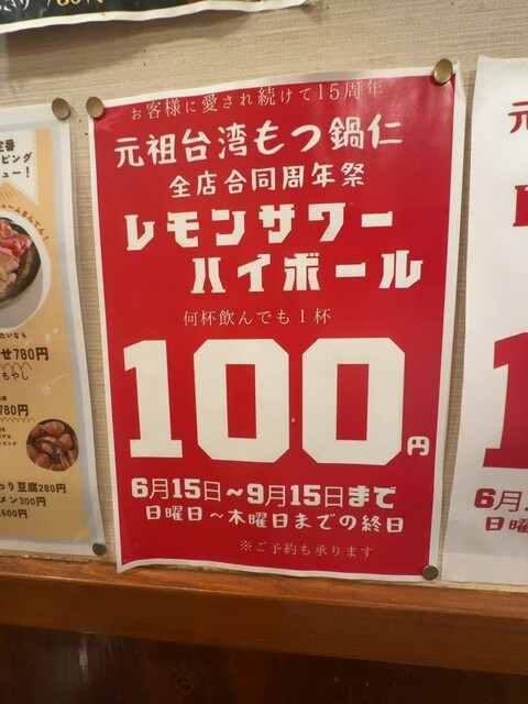 周年でハイボール、レモンサワーが100円ですが、前々回きた時は入れず、前回来たときは土曜日で対象外でした。