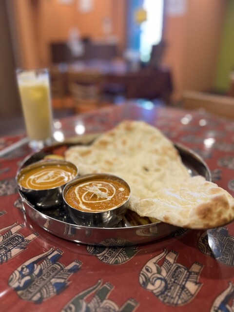 本日のお目当てのサモサを食べるために、初めてホリデースペシャルをお願いします。カレーはキーマとほうれん草チキンを4辛で。ナン。ドリンクはマンゴーラッシー。