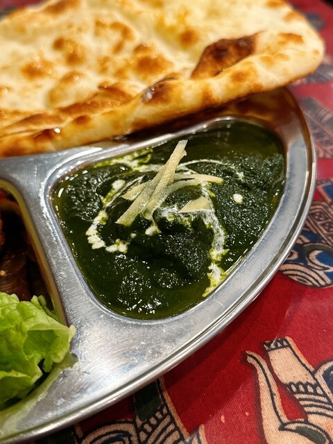 今日はあまりお腹が空いてなかったので、普通のランチセットにしました。常にキーマカレーを選んでしまう私ですが、今回は初めてのものをと思い、ほうれん草チキンカレーの激辛をナンとマンゴーラッシーでお願いしました。