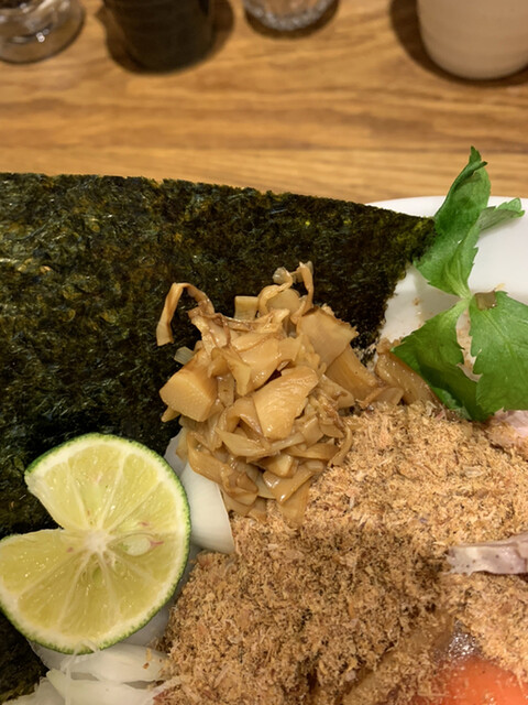 まずはすだちを絞って底から良く混ぜます。では一口、いろいろな味が複雑に絡み美味いです。トッピングのお肉は仕上がりが素早くこの麺に合ってますね。平打ちなのでタレと良く絡みます。メンマや玉ねぎも美味しいですね。