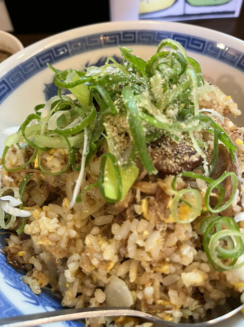 まずは具材からたまご、玉ねぎ、ねぎ、チャーシューですね。糸状のチャーシューが全体にあります。では一口、パラパラ度は中の上でしっとり感がありますが焦げているところもありこの炒飯にはもっとも合っていますね。チャーシューが全体に満遍なく入っていて凄い美味いです。こんな炒飯食べたことはなく衝撃的ですね。チャーシューの塊が2つ入ってましたがジューシーで素晴らしいですね。スープはラーメンのスープらしく牛骨でしょうか炒飯に合っていてよかったです。ご飯の量が多く茶碗2杯以上はありました。福神漬けやキムチや高菜漬けもよく最後はきつかったですが美味しく完食しました。
