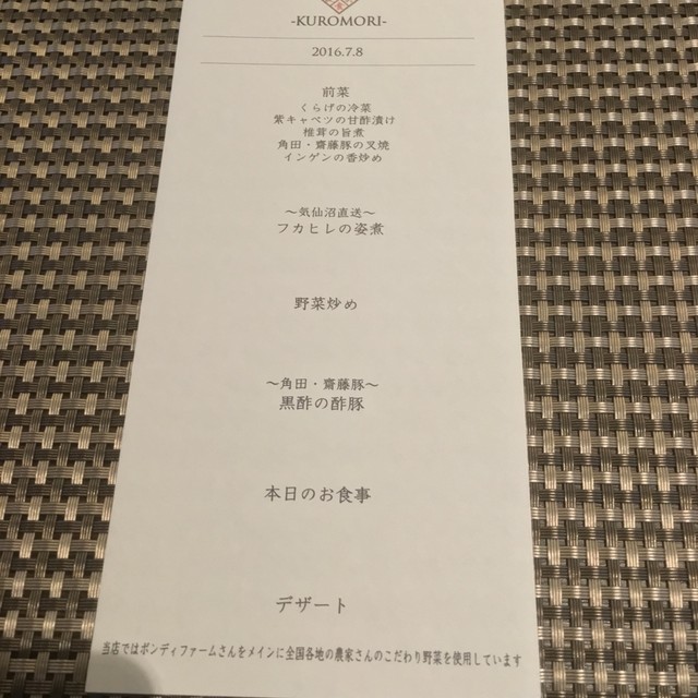 本日は、特別イベント回鍋肉定食の会に行ってきました。通常営業とは、異なり誰もが知っている中華料理にスポットを当て、黒森シェフが昇華させる。本人は、必ず特別なことしてない、美味しく作ってるだけ!と、言いますが…(笑)齋藤豚という美味しい豚肉でつくる回鍋肉にご飯と薬膳スープをベースにしたトマトスープ。サイドメニューに、よだれ鶏、鰤の老酒漬け、齋藤豚のスペアリブ叉焼で終了。イベントでも、一切手を抜きません。ごちそうさまでした。