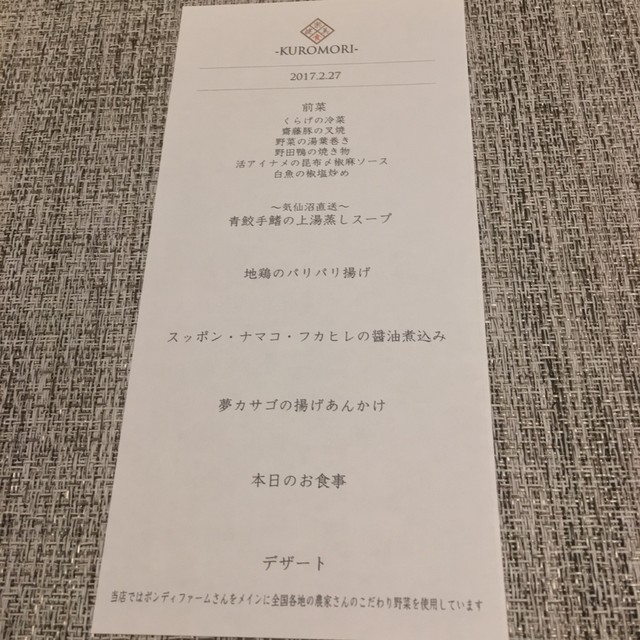 黒森さんの人柄、スタッフ、料理全てに気に入り再訪することでしょう。