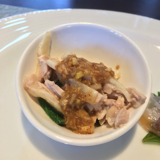 前菜 蒸し鶏のふきのとうソース 小松菜の葱オイル和え アワビ茸のXO醤ソース