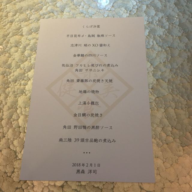 個人的に忙しくなって、ほぼ10ヶ月ぶりに仙台市の完全予約制『KUROMORI』さんにお邪魔しました。コースも15,000円と25,000円の二本にした模様。スタッフも変わりました。改装を得てリニュアル初日にお邪魔しました。今回、25,000円のコースにしました。前菜に、『クラゲ冷菜』、『平目の昆布〆』、『烏賊 椒麻ソース』、『志津川 蛸のXO醤和え』、『金華鯖の四川ソース』。次に、『フカヒレの尾びれの煮込み』を角田のササニシキとともにいただきます。次に角田 『齋藤豚の炭焼き叉焼』、次に『地鶏の焼物』、次に『上海小籠包』、次に『金目鯛の炭焼き』、次に角田『野田鴨の黒酢ソース』、次に南三陸『39頭吉浜鮑の煮込み』、お食事は2種類『光麺』と『叉焼炒飯』、デザートは『杏仁豆腐 八朔とココナッツミルク』と『マーラーカオ』ごちそうさまでした。