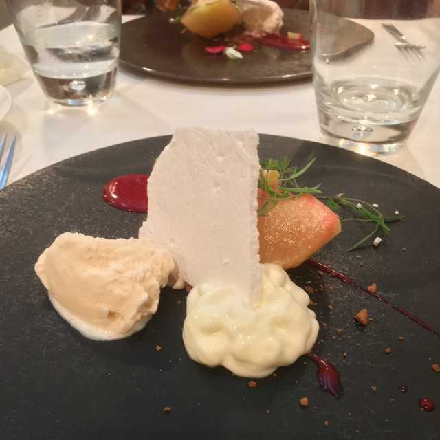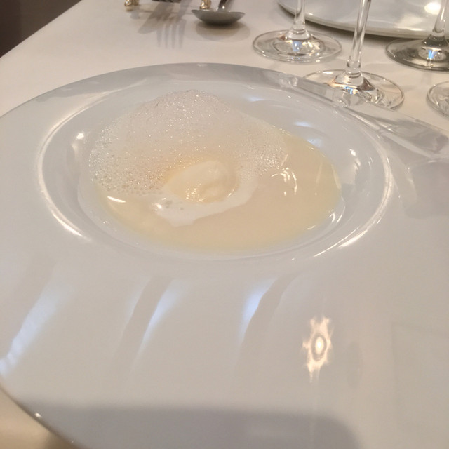 ヴィシソワーズ、胡椒の泡とバターのジェラート