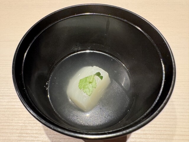 海水を加えて蒸した玉ねぎ(兵庫・淡路島 原田氏)を ぜんな(小ハマグリ 千葉・九十九里)と鱧の骨からとった出汁のスープと ◎